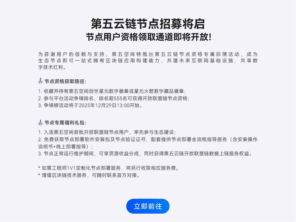 作为一款高效稳定的联盟链,第五云链以秒级确认和万级TPS(每秒交易处理量)为核心优势,满足政务、金融、供应链、AI、教育等多领域的高性能需求。其金融级隐私保护机制通过先进的加密技术,确保数据安全与合规性,为用户提供可信的数字环境。